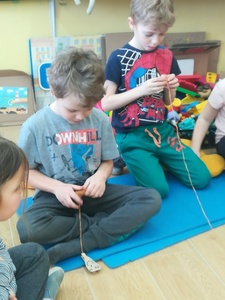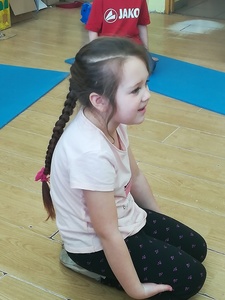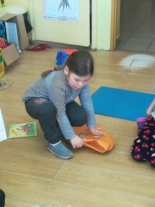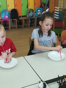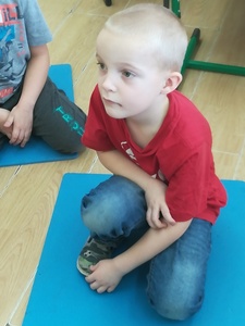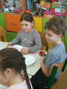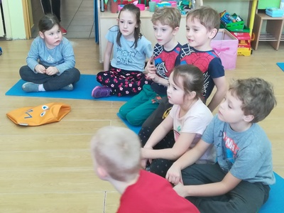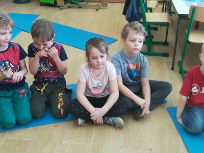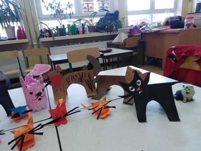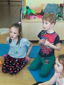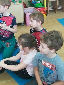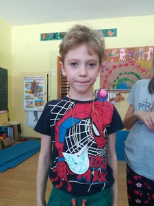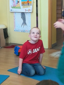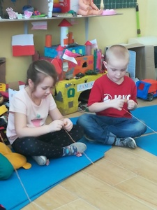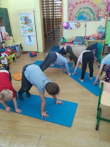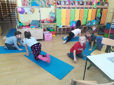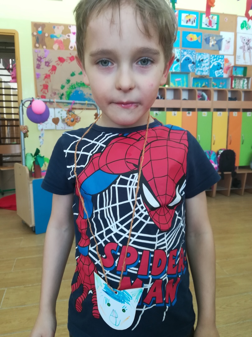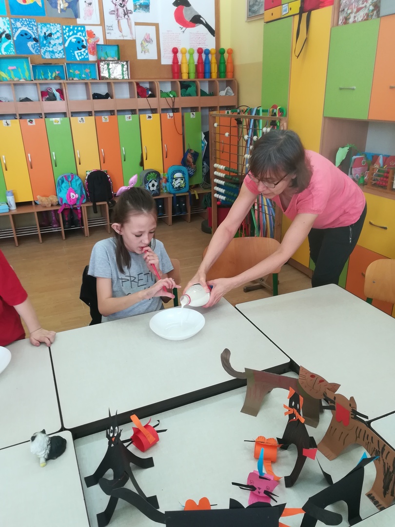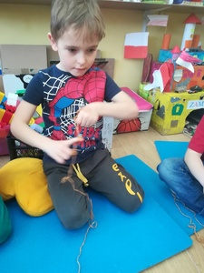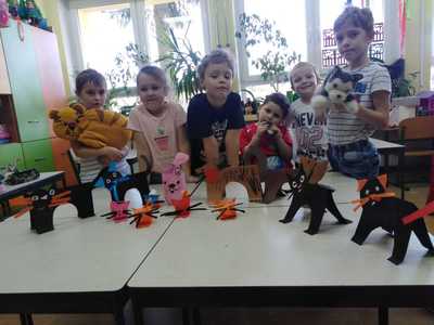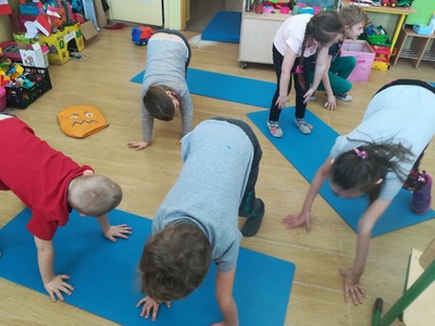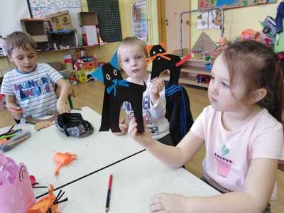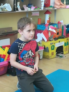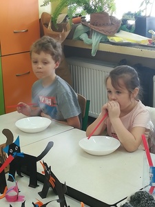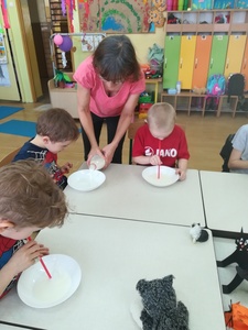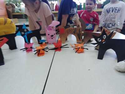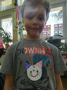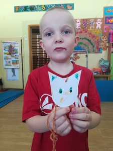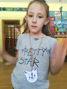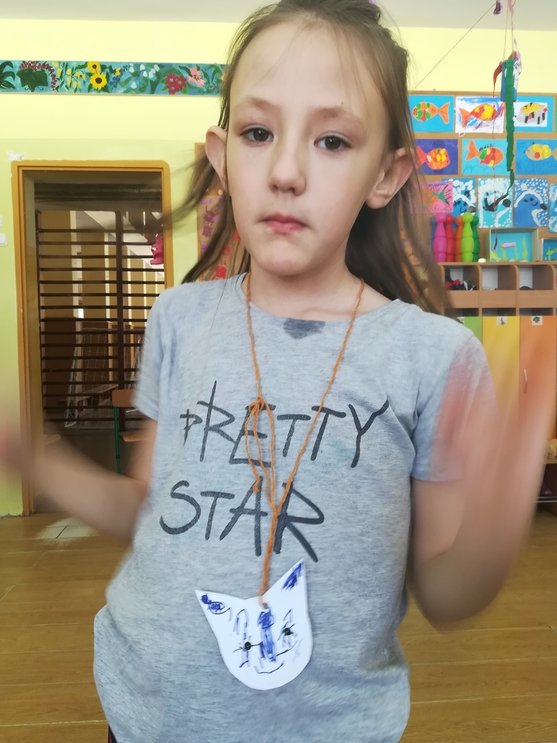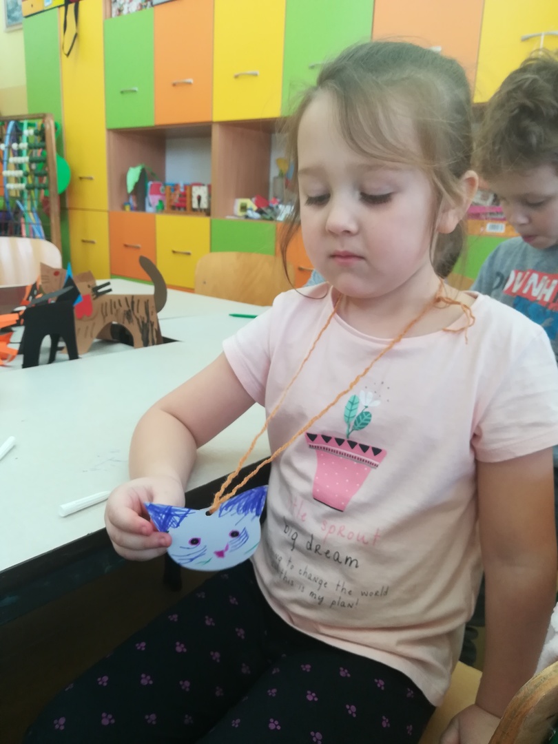 Dzieci miały także okazję poczuć się przez chwilę jak kot... Otóż chodzenie na czworaka, wyginanie kręgosłupa w koci grzbiet, wydawanie odgłosów, polowanie na myszkę, zwijanie włóczki, picie mleka słomką było świetną okazją do ćwiczenia zdolności manualnych, a także całego ciała. Małą motorykę przedszkolaki doskonaliły wykonując prace plastyczne oraz zadania, przygotowane przez wychowawczynię. Dzieci poza pięknymi kotkami samodzielnie ozdobiły medale oraz opaski na głowę.