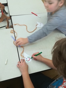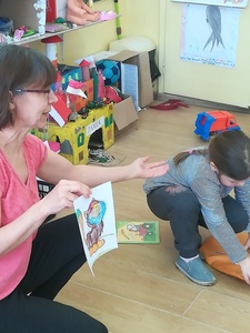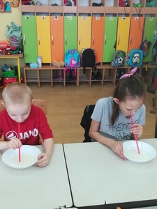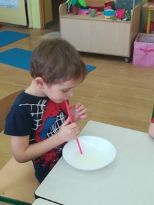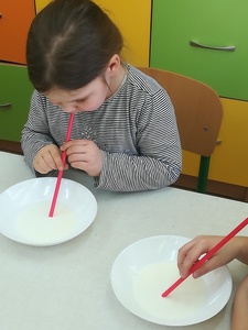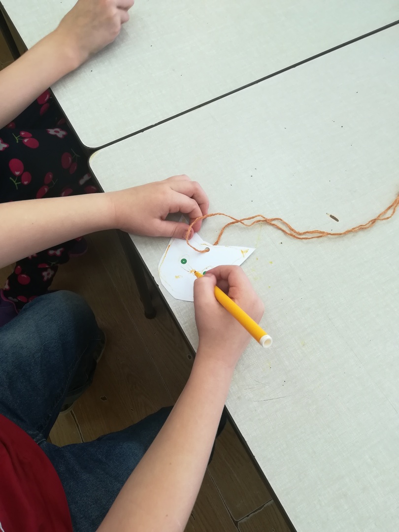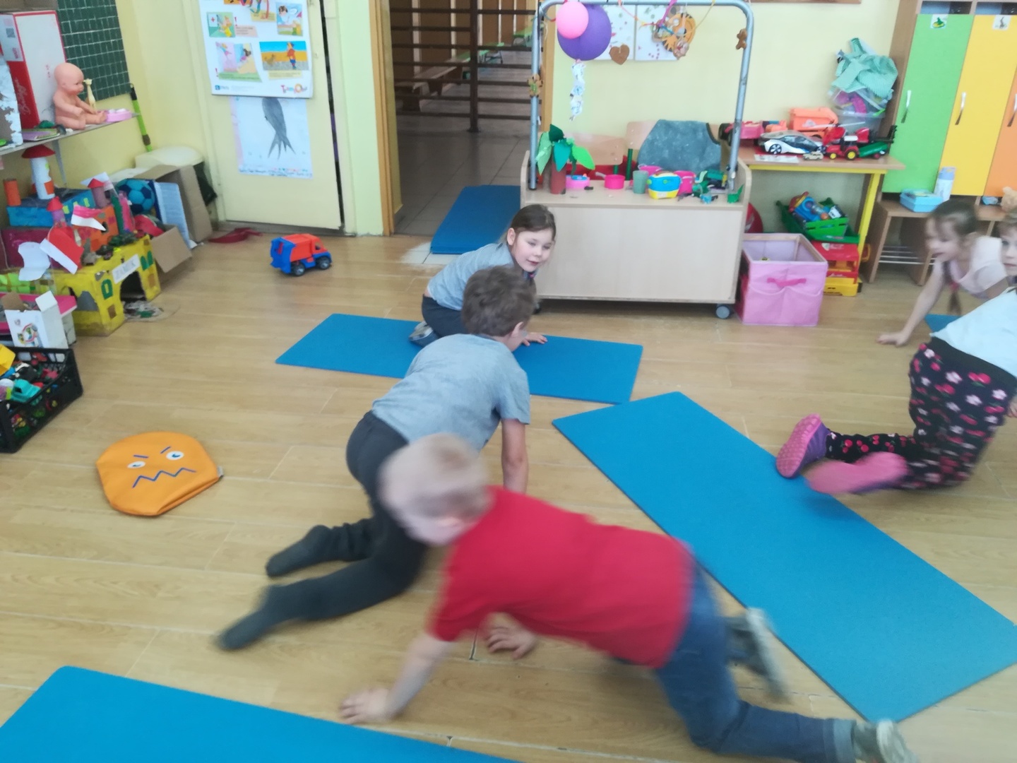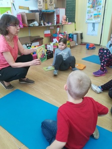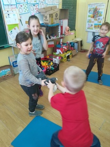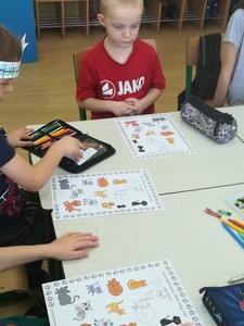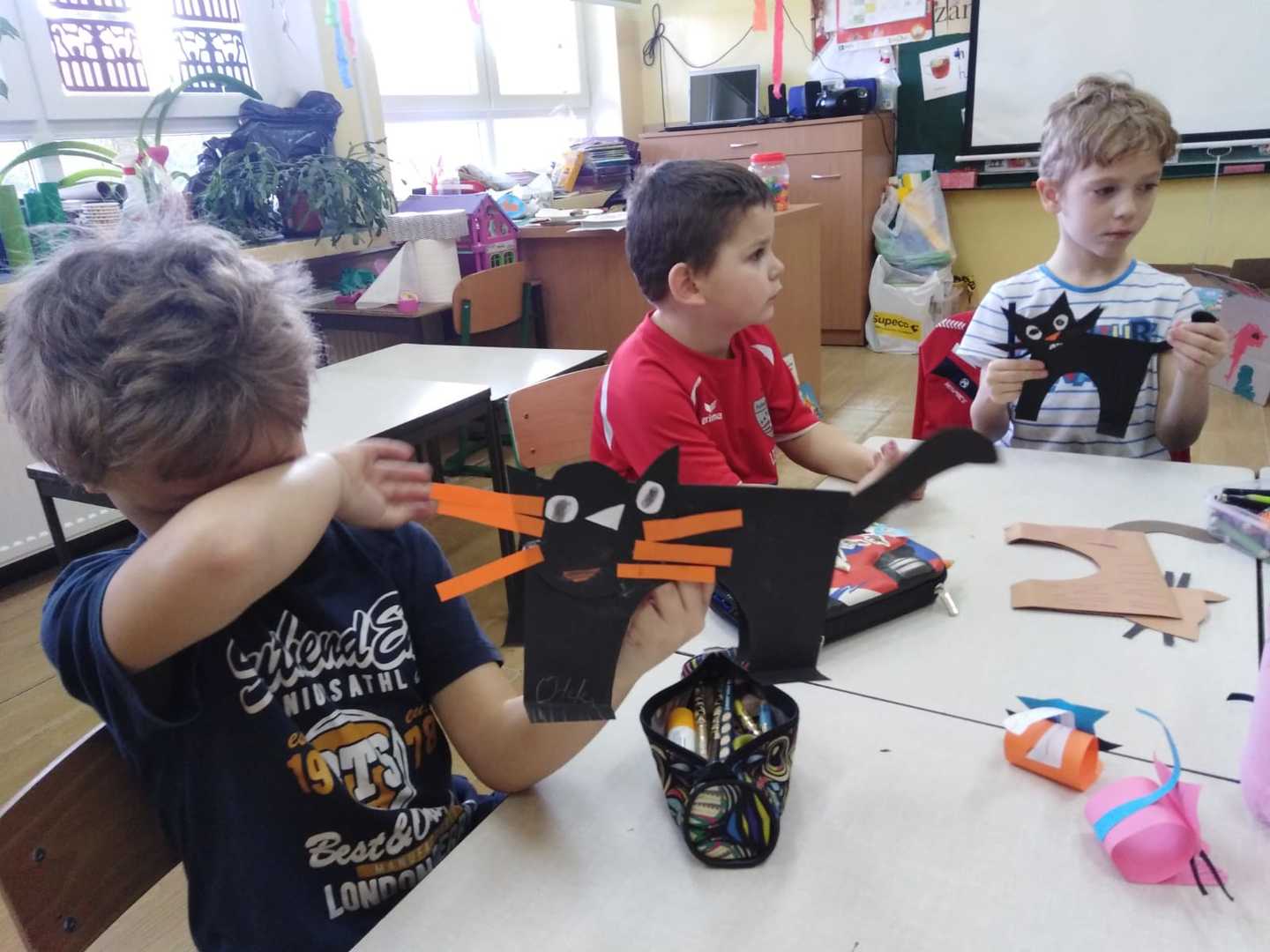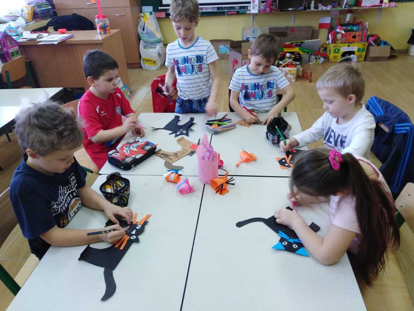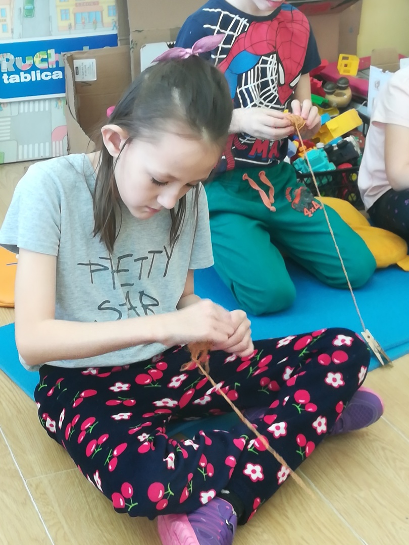 Dzieci miały także okazję poczuć się przez chwilę jak kot... Otóż chodzenie na czworaka, wyginanie kręgosłupa w koci grzbiet, wydawanie odgłosów, polowanie na myszkę, zwijanie włóczki, picie mleka słomką było świetną okazją do ćwiczenia zdolności manualnych, a także całego ciała. Małą motorykę przedszkolaki doskonaliły wykonując prace plastyczne oraz zadania, przygotowane przez wychowawczynię. Dzieci poza pięknymi kotkami samodzielnie ozdobiły medale oraz opaski na głowę.