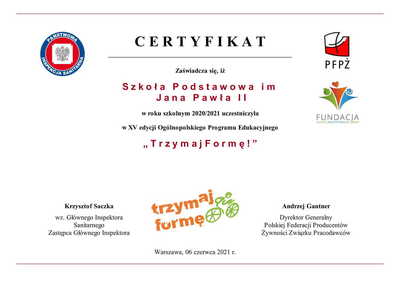 Certyfikat "Trzymaj Formę" Zdjęcia Zobacz również POMOC Dzień Dziecka „Czy wiesz, że możesz mówić „nie” zagrożeniom... Certyfikat "Trzymaj Formę" Inormacja Certyfikat 10 czerwca 2021 Aktualności Wydrukuj Udostępnij Wyświetlono: 213