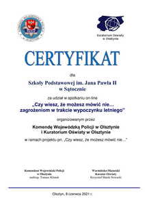 Certyfikat Zdjęcia Zobacz również „Czy wiesz, że możesz mówić „nie” zagrożeniom... Certyfikat "Trzymaj Formę" Inormacja Certyfikat Kierunek: Owczarnia! „Załóż wygodne buty, masz do przejścia całe życie…” 17 czerwca 2021 Aktualności Wydrukuj Udostępnij Wyświetlono: 230