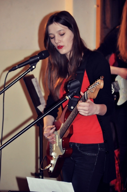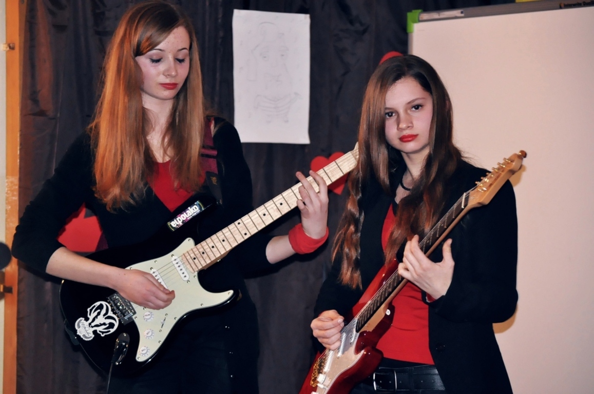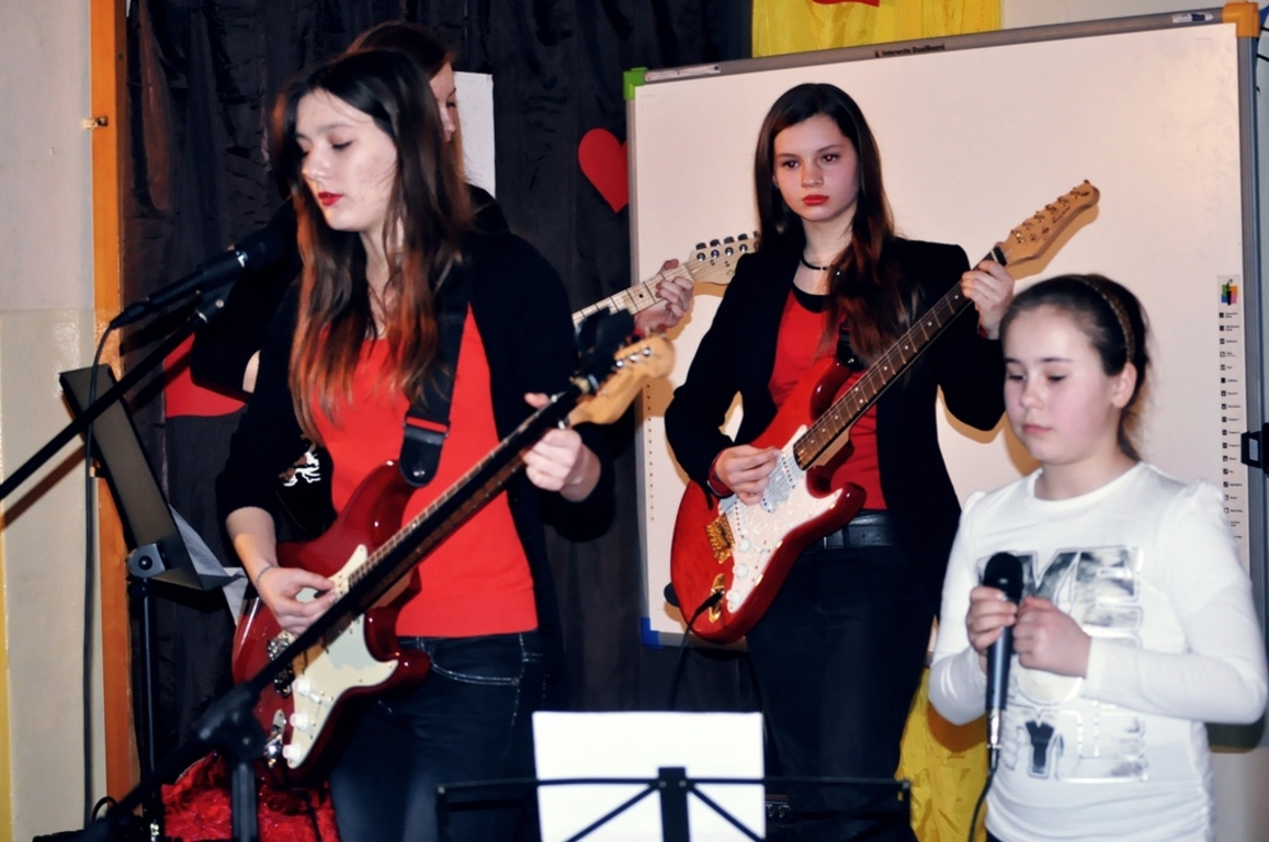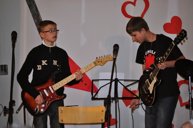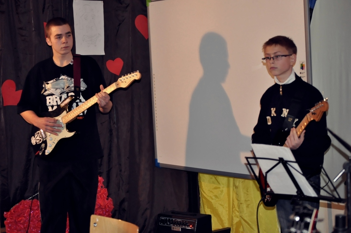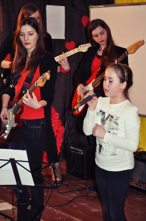 Spotkanie rozpoczęła krótka prezentacja o Walentynkach przygotowana przez Samorząd Uczniowski Gimnazjum , którą pięknie przedstawiła Natalia Chamera. Potem wystąpił nasz szkolny zespół muzyczny w następującym składzie: na perkusji- Szymon Łuszczak , gitara basowa- Rafał Ligęza, gitary elektryczne- Remigiusz Pawelczyk, Mateusz Stankiewicz i Maciej Bieńkowski. Chłopcy z gitarami wyglądali olśniewająco . Grali z niezwykłą energią i pasją . Można było dostrzec w nich lekkość i dobre samopoczucie na scenie. Po wykonaniu kompozycji instrumentalnej zaśpiewała Sara Zarębińska, która była perełką sceny . Wystąpiła ona w utworze ,,Jest gdzieś taki dom”. Między utworami muzycznymi był czas na chwilę refleksji . Magda Stróg i Emilia Prusinowska zaprezentowały nam cytaty o miłości , które wzruszyły naszą publiczność. Przyszedł wreszcie czas na premierowe wykonanie utworu z repertuaru The Beatles- „All my loving”. Następnie wystąpiła uczennica klasy III gimnazjum Karolina Fil w utworze ,,Do kogo idziesz?”. Kolejnym akcentem imprezy były życzenia walentynkowe, które przeczytały nasze prowadzące: Diana Prusinowska i Natalia Subocz. Swój talent muzyczny zaprezentowała Dominika Paluch z klasy III SP w utworze prawdziwie miłosnym ,, Wszystko mi mówi, że mnie ktoś pokochał”. „Jak wygląda zakochanie w oczach dzieci ?”- tego dowiedzieliśmy się z prezentacji przedstawionej przez dziewczęta z klasy II G. Przyszedł czas na gościa wieczoru . Przed nami wystąpiły rockandrollowe dziewczyny z Miejsko-Gminnego Ośrodka Kultury w Sępopolu. Opiekunem młodych gitarzystek jest pan Janusz Bieńkowski. Publiczność z uwagą i zaangażowaniem wsłuchiwała się w grę i śpiew dziewcząt. Wypadły one świetnie. Są obdarzone nie tylko talentem muzycznym, ale również urodą . Bardzo miło było gościć takie osoby w naszej szkole. Nasze konferansjerki zakończyły koncert refleksyjnym podsumowaniem, lecz zanim publiczność się rozeszła pan dyrektor zagrał piękny utwór zadedykowany swojej ukochanej żonie. Po tym występie, w romantycznym klimacie, publiczność opuściła naszą szkołę.