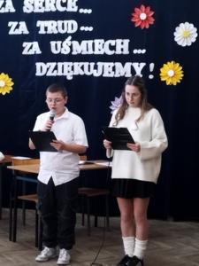 Słowa uznania popłynęły także od przewodniczącej Rady Rodziców Pani Jadwigi Zadwornej, która mówiła o pracy nauczycieli i pracowników szkoły jako pełnym poświęcenia zawodzie. Następnie przedstawiciele Rady Rodziców wręczyli róże na ręce pracowników szkoły, a w pokoju nauczycielskim czekał przepyszny tort.