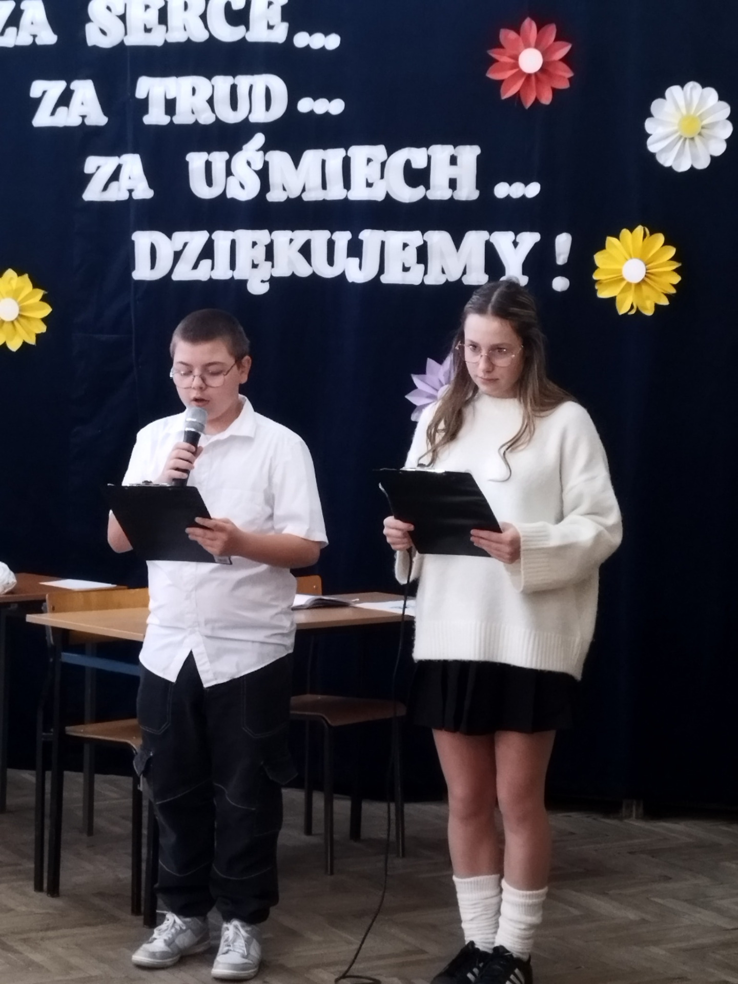 Najmłodsi uczniowie zachwycili publiczność pięknymi piosenkami, a starsi zaprezentowali zabawne scenki z życia szkolnego, pełne humoru i ciepła.