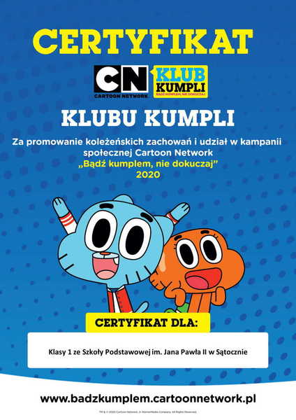 09 grudnia 2020 Aktualności Podziękowania za udział w akcji "Bądź kumplen, nie... Szkoła Podstawowa im. Jana Pawła II w Sątocznie wzięła udział w akcji ,,Bądź kumplem, nie dokuczaj” zainicjowanej przez naszego wybitnego skoczka narciarskiego – Kamila Stocha. Uczniowie klasy... Czytaj więcej